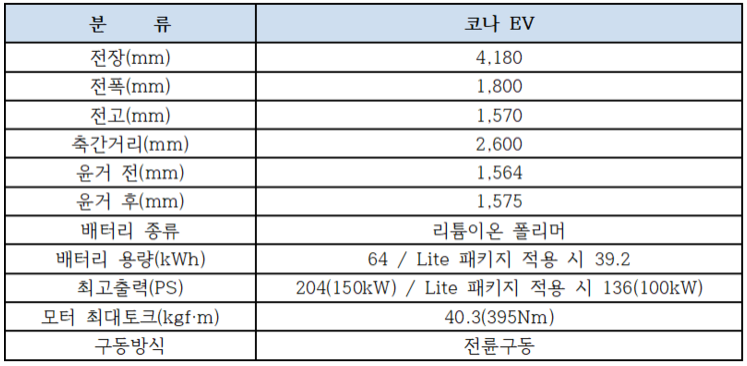 코나 EV의 공인 표준연비 및 등급은 복합 5.6km/kWh(도심 6.2km/kWh, 고속도로 5.0km/kWh)이며 CO₂ 배출량 0g/km, 축전지 정격전압(용량)은 356V(180Ah), 공차중량 1,685kg, 1회 충전 주행거리 복합 406km(도심 444km, 고속도로 359km)입니다.