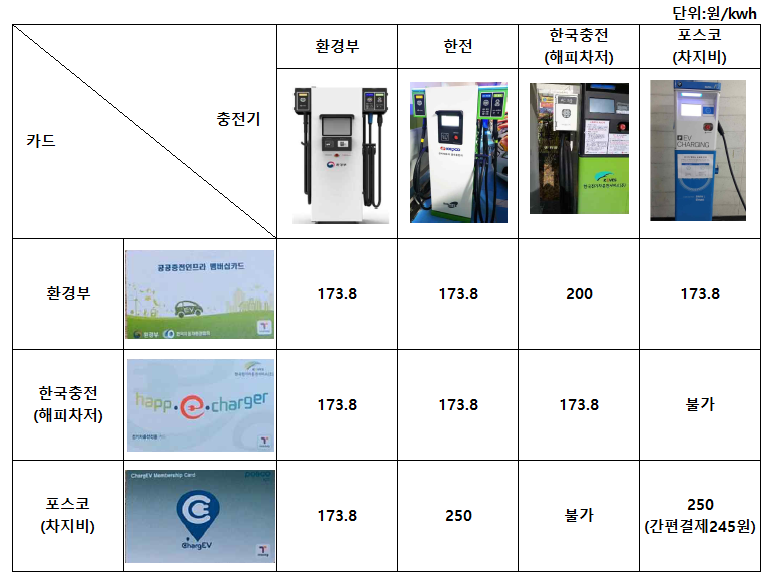 아래는 완속 충전기 사업자별 충전 요금 표입니다.