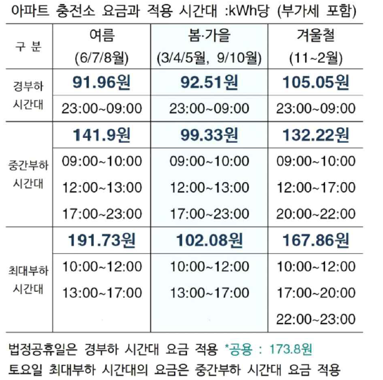 아래는 완속 충전기 요금 표입니다.