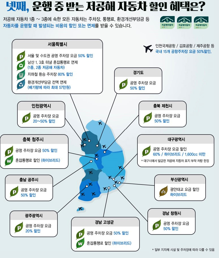 전기차는 1종 저공해자동차로 공영주차장, 인천공항주차장 등 할인이 가능합니다.