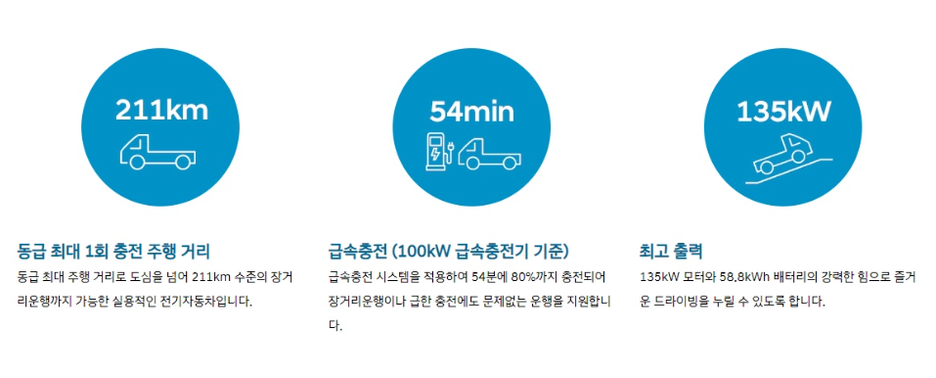최고출력 135kW, 최대토크 395Nm / 배터리 용량 58.8kWh (주행거리 211km)