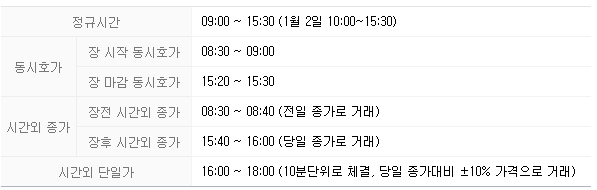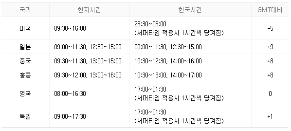 국가별로 증권 거래소 개장/폐장 시간이 다릅니다.
