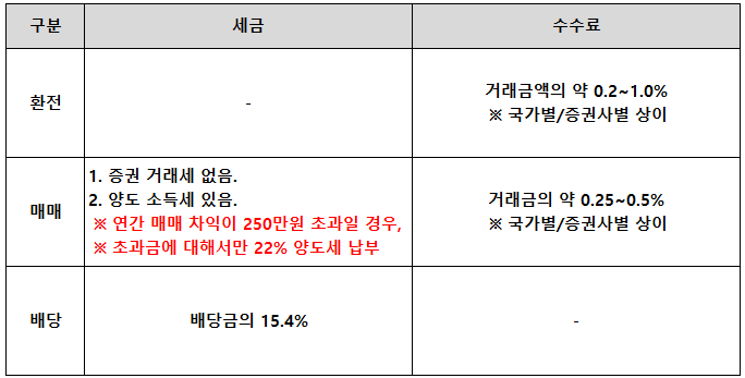 2. 매매 수수료 : 거래대금의 약 0.25~0.5% (국가/증권사별 상이)