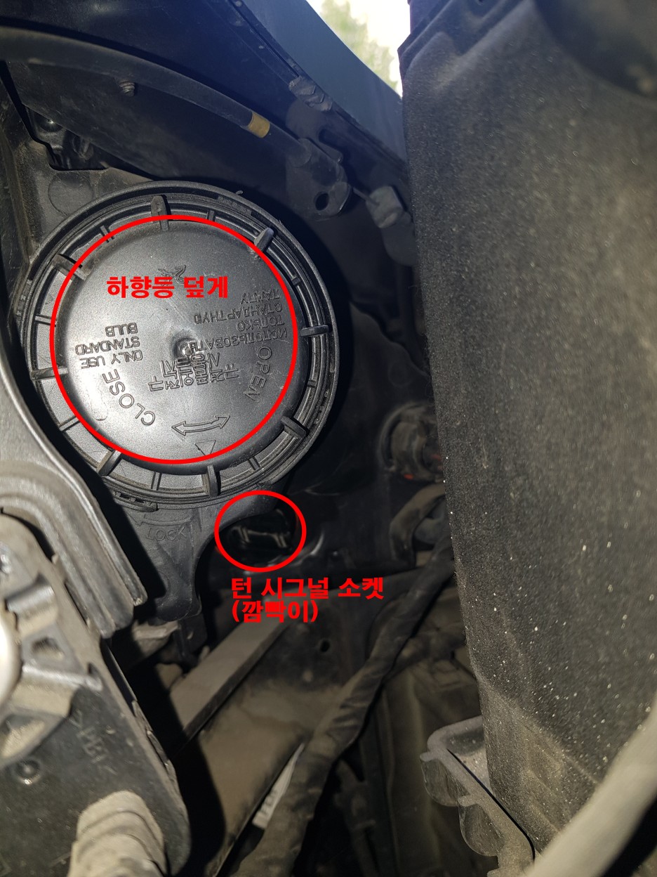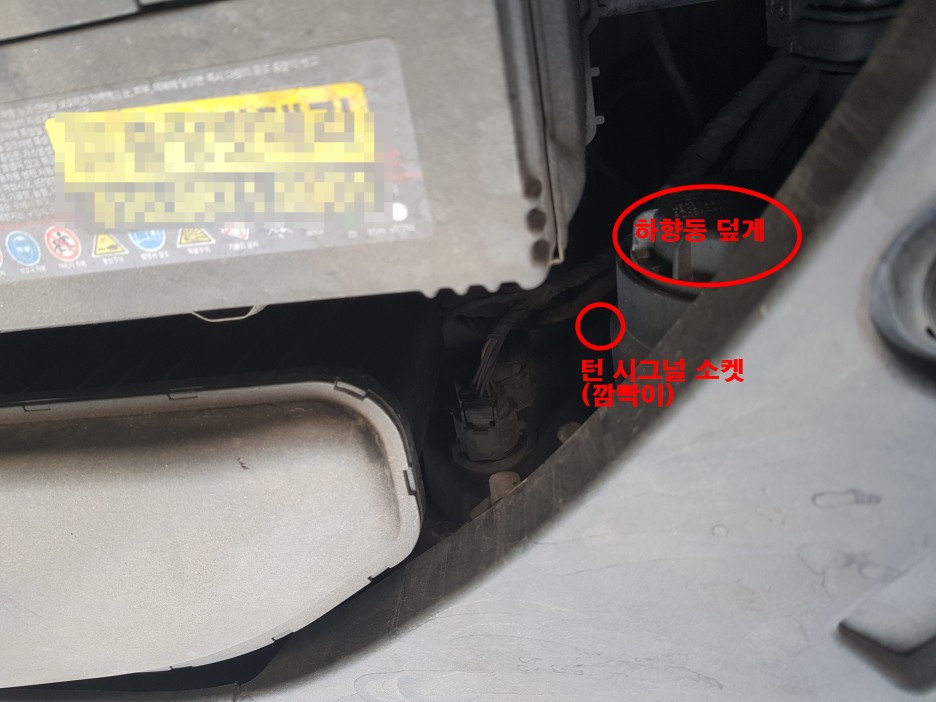 깜빡이는 하향등 덮게 아래에 위치하고 있습니다.